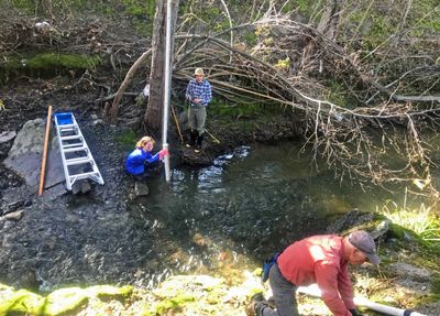 A group of FOC Board members, together with an OIS student who is a prospective Eagle Scout, worked for two hours in early January to install staff gages and a stilling well that houses a water depth and temperature data logger. They then measured the dimensions of the creek channel at the installation. The data logger stores readings every 15 minutes, and will allow FOC to calculate the flow over time. When storms occur, San Pablo Creek rises as the watershed around Orinda produces runoff. By combining that information with precipitation, we will begin to be able to predict how much the stream will rise in response to forecasted rain. The datalogger also records water temperature, an important factor for knowing if trout can prosper in the downtown reach of San Pablo Creek.
